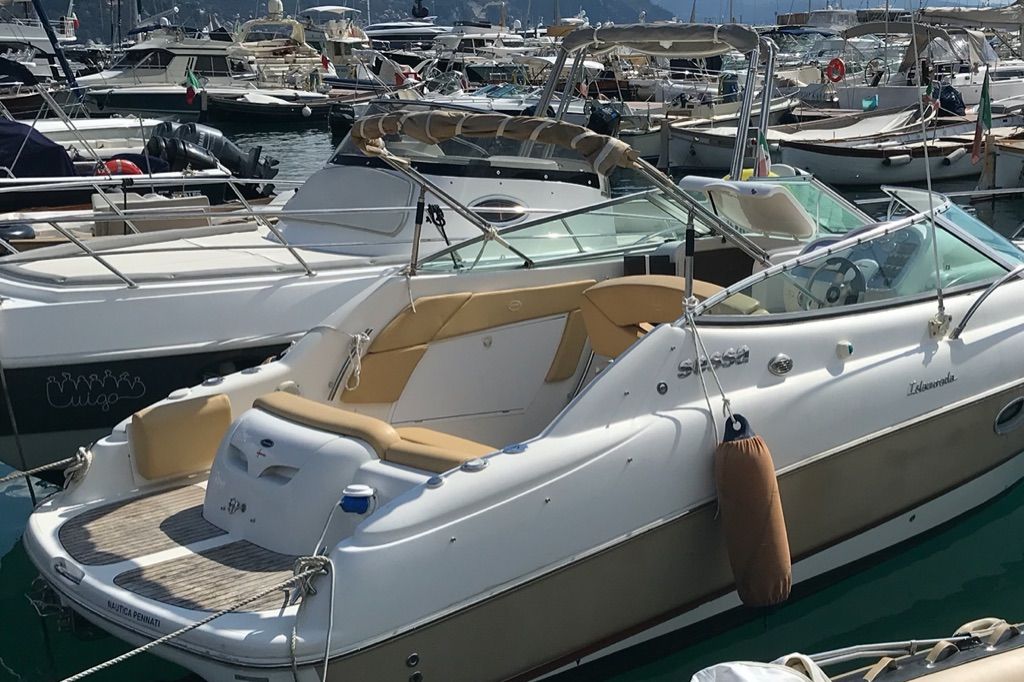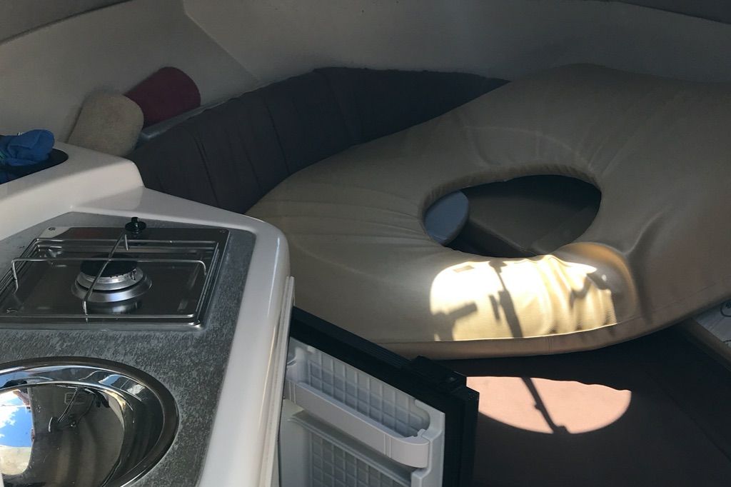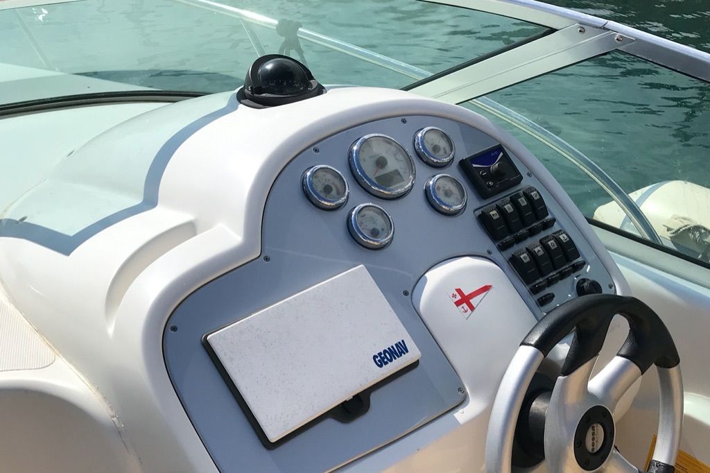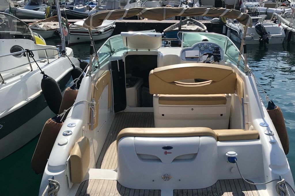 Imbarcazione Day cruiser equipaggiata con frigorifero elettrico, WC marino, teak in pozzetto e in plancetta, ampio prendisole di poppa trasformabile in zona pranzo, cucina interna con lavello e fornello a gas Tendalino parasole in acciaio, copertura totale barca.